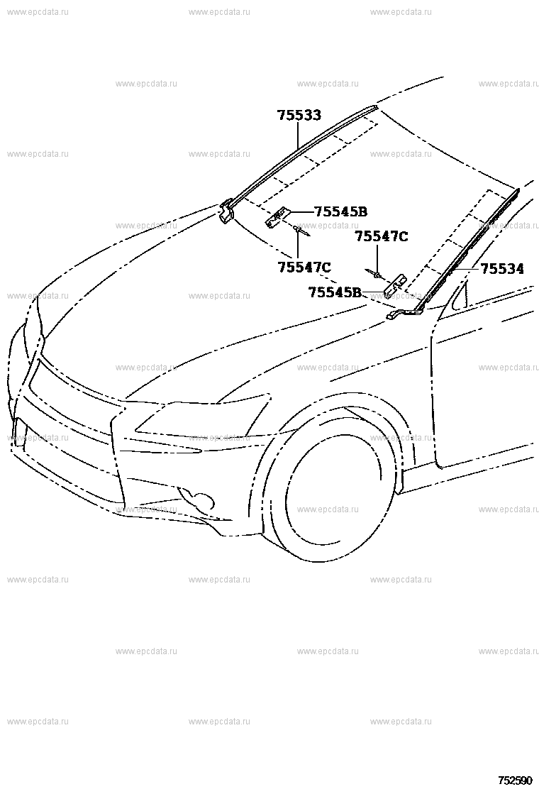 Click part number in the scheme or in the list: 75533 MOULDING, WINDSHIELD, OUTSIDE RH75534 MOULDING, WINDSHIELD, OUTSIDE LH 75545B CLIP, WINDSHIELD OUTSIDE MOULDING, NO.1 75547C CLIP, WINDSHIELD OUTSIDE MOULDING, NO.3 |