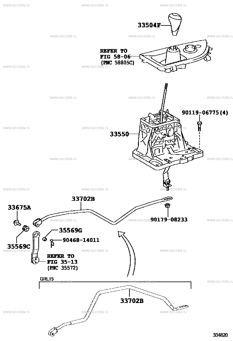Click part number in the scheme or in the list: ** 58-0633504F KNOB SUB-ASSY, SHIFT LEVER 33550 FLOOR SHIFT ASSY, TRANSMISSION 33702B ROD SUB-ASSY, GEAR SHIFTING, NO.1 (FOR FLOOR SHIFT) 9017908233 ** Std Part 33675A PIN, W/HOLE (FOR TRANSMISSION CONTROL ROD) 9046814011 ** Std Part 9011906775 ** Std Part 35569G BUSH (FOR TRANSMISSION CONTROL ROD) 35569C GROMMET (FOR TRANSMISSION CONTROL ROD) ** 35-13 |