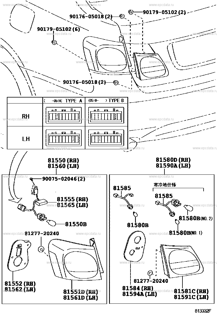 Click part number in the scheme or in the list: 81585 SOCKET AND WIRE, REAR LAMP81584 PACKING, REAR LAMP RH 81594A GASKET, REAR LAMP LH 81580B BULB (FOR REAR LAMP) 81551D LENS & BODY, REAR COMBINATION LAMP, RH 81561D LENS & BODY, REAR COMBINATION LAMP, LH 81581C LENS AND BODY, REAR LAMP, RH 81591C LENS, REAR LAMP, LH 9017905102 ** Std Part 8127720240 ** Std Part 9017605018 ** Std Part 81552 GASKET, REAR COMBINATION LAMP LENS, RH 81562 GASKET, REAR COMBINATION LAMP LENS, LH 81580D LAMP ASSY, REAR, RH 81590A LAMP ASSY, REAR, LH 81550 LAMP ASSY, REAR COMBINATION, RH 81560 LAMP ASSY, REAR COMBINATION, LH 81550B BULB(FOR REAR COMBINATION LAMP) 81555 SOCKET & WIRE SUB-ASSY, REAR COMBINATION LAMP, RH 81565 SOCKET & WIRE SUB-ASSY, REAR COMBINATION LAMP, LH 9007502046 ** Std Part |