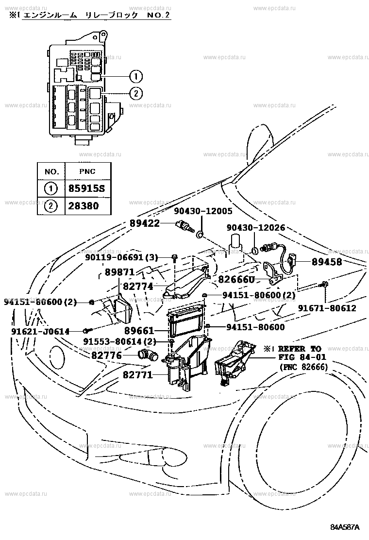 Click part number in the scheme or in the list: 85915S RELAY, HEATER (FOR AIR FUEL RATIO SENSOR)89422 SENSOR, WATER TEMPERATURE (FOR E.F.I.) 9043012005 ** Std Part 89458 SENSOR, FUEL PRESSURE 9043012026 ** Std Part 9415180600 ** Std Part 9011906691 ** Std Part 82771 BOX, ENGINE ROOM ECU 82776 DUCT, ENGINE ROOM ECU OUTLET 9155380614 ** Std Part 89661 COMPUTER, ENGINE CONTROL 82774 COVER, ENGINE ROOM ECU 89871 DRIVER, INJECTOR 91621J0614 ** Std Part 9167180612 ** Std Part 82666U HOLDER, CONNECTOR 28380 RELAY ASSY, FUEL PUMP ** 84-01 |