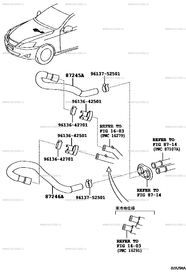 Click part number in the scheme or in the list: 87245A HOSE, HEATER WATER, INLET A87246A HOSE, HEATER WATER, OUTLET A 9613642501 ** Std Part 9613642701 ** Std Part 9613752501 ** Std Part ** 16-03 ** 87-14 |