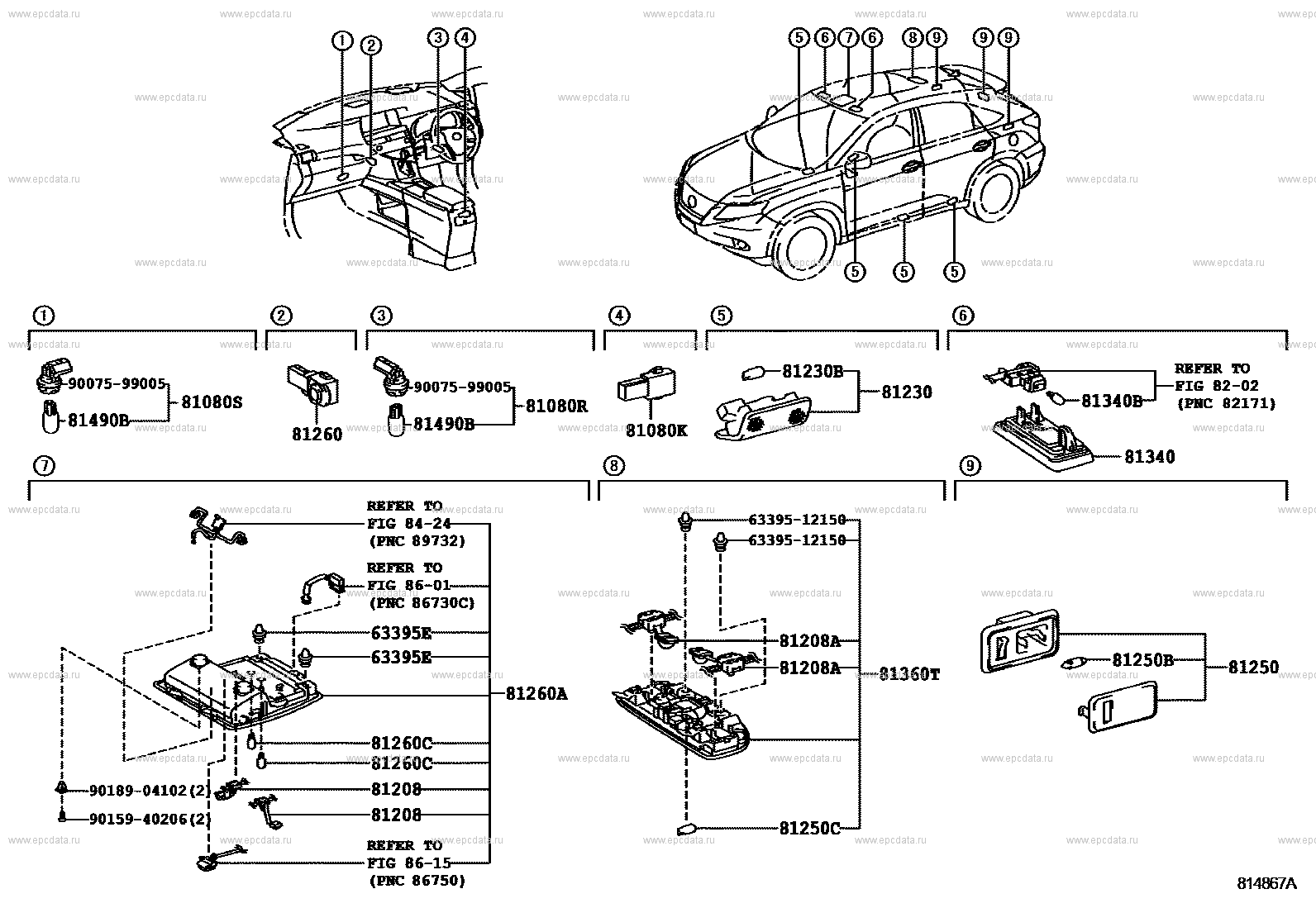 Click part number in the scheme or in the list: 81260 LAMP ASSY, GLOVE BOX81340 LAMP ASSY, VANITY 81080S LAMP ASSY, INTERIOR ILLUMINATION, NO.1 LH 81490B BULB (FOR FOOT LAMP) 81080R LAMP ASSY, INTERIOR ILLUMINATION, NO.1 RH 81250 LAMP ASSY, ROOM, NO.2 81080K LAMP ASSY, CONSOLE BOX ILLUMINATION 81230 LAMP ASSY, COURTESY 81230B BULB(FOR COURTESY LAMP) 81340B BULB (FOR VANITY LAMP) 9007599005 ** Std Part ** 82-02 81250B BULB, ROOM LAMP, NO.2 81360T LAMP ASSY, SPOT 6339512150 ** Std Part 81250C BULB, SPOT LAMP 81208A LAMP SUB-ASSY, MAP, NO.2 ** 86-01 ** 86-15 ** 84-24 63395E CLIP(FOR MAP LAMP) 81260A LAMP ASSY, MAP 81260C BULB(FOR MAP LAMP) 81208 LAMP SUB-ASSY, MAP 9018904102 ** Std Part 9015940206 ** Std Part |