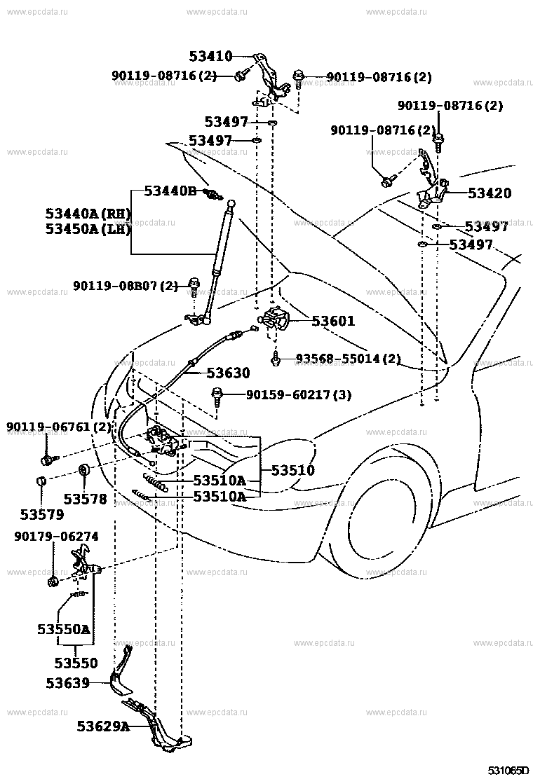 Click part number in the scheme or in the list: 53410 HINGE ASSY, HOOD, RH9011908716 ** Std Part 53440B BOLT, HOOD SUPPORT, NO.1 53497 PAD, HOOD HINGE, NO.1 53420 HINGE ASSY, HOOD, LH 53601 LEVER SUB-ASSY, HOOD LOCK CONTROL 9356855014 ** Std Part 53630 CABLE ASSY, HOOD LOCK CONTROL 9015960217 ** Std Part 53510 LOCK ASSY, HOOD 53510A SPRING, TENSION(FOR HOOD LOCK) 9011908B07 ** Std Part 9011906761 ** Std Part 53578 NUT, HOOD LOCK 53579 CAP, HOOD LOCK NUT 9017906274 ** Std Part 53440A SUPPORT ASSY, HOOD, RH 53450A SUPPORT ASSY, HOOD, LH 53550A SPRING, TORSION(FOR HOOD LOCK HOOK) 53550 HOOK ASSY, HOOD AUXILIARY CATCH 53639 COVER, HOOD LOCK CONTROL CABLE, NO.2 53629A COVER, HOOD LOCK CONTROL CABLE |
