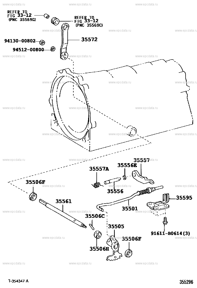 Click part number in the scheme or in the list: 9451200800 ** Std Part91611B0614 ** Std Part 9413000802 ** Std Part 35501 ROD SUB-ASSY, PARKING LOCK 35505 LEVER SUB-ASSY, MANUAL VALVE 35506C PIN, SLOTTED SPRING (FOR MANUAL VALVE LEVER SHAFT) 35506F SEAL, OIL (FOR MANUAL VALVE LEVER SHAFT) 35556 SHAFT, PARKING LOCK PAWL 35556E RING, E (FOR PARKING LOCK PAWL SHAFT) 35557 PAWL, PARKING LOCK 35557A SPRING, TORSION (FOR PARKING LOCK PAWL) 35561 SHAFT, MANUAL VALVE LEVER 35595 BRACKET, PARKING LOCK PAWL 35572 LEVER, TRANSMISSION CONTROL SHAFT, RH ** 33-12 35506H SPACER (FOR MANUAL VALVE LEVER SHAFT) |